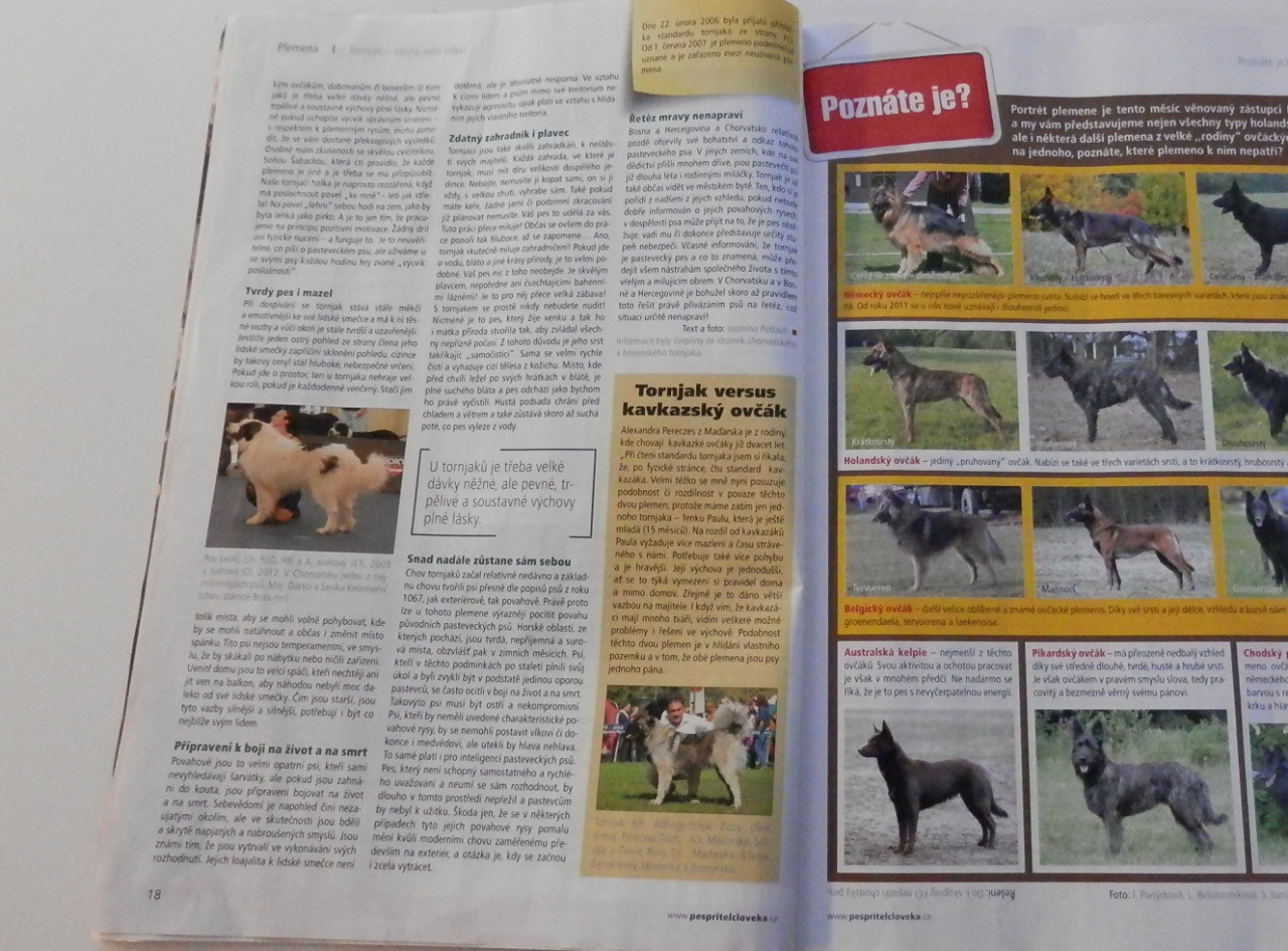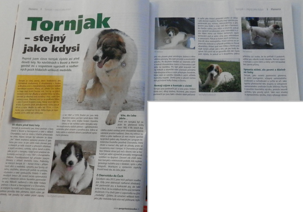 23.02.2013 09:35Časopis Pes Přítel Člověka, v č.3/2013, uveřejnil článek o tornjacích. Vzhledem k tomu, že v Česku jen málokdo ví o tom, že plemeno jako Tornjak existuje, je to pro nás velký krok vpřed. Snad se stané, že zanedlouho již nebudeme sami ve výstavním kruhu:-)